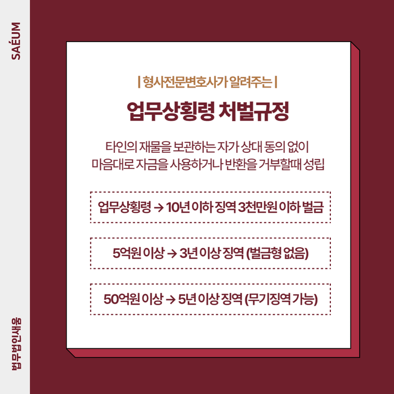 일반적인 횡령은 5년 이하 징역 혹은 1,500만 원 이하 벌금형에 처하게 되지만, 직장 내에서 이와 같은 일을 저지르게 되면 업무상횡령이 적용되어 10년 이하 징역 혹은 3,000만 원 이하 벌금형에 처하게 됩니다.