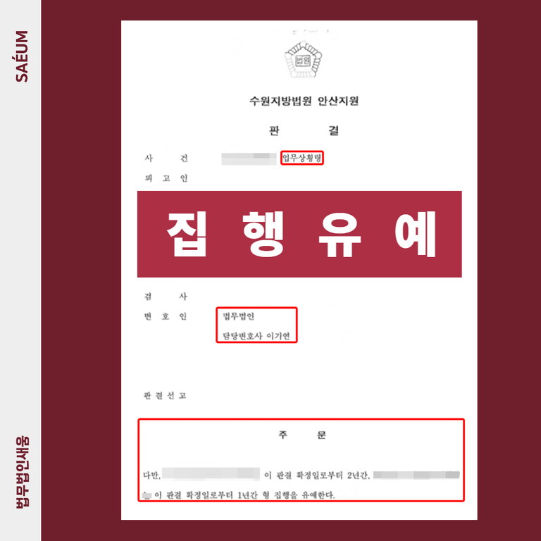 또한 횡령 자체가 초범이라는 점 등을 강조하여 선처를 호소하였는데요. 재판부에서는 법무법인 새움 측의 주장을 수용하여 집행유예 판결하게 되었고 A씨는 불리한 상황이었음에도 선처를 받을 수 있었습니다.