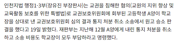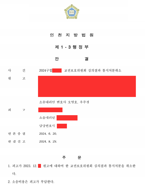 교육활동 침해행위를 인정하였습니다.