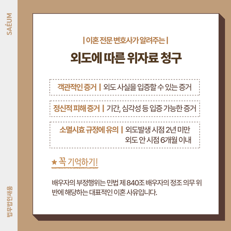 또한 소멸시효 규정에도 유의해야 합니다. 배우자의 외도를 안 시점으로부터 6개월 이내에 소송을 제기해야만 법적으로 인정받을 수 있으며, 외도 발생 시점으로부터 2년이 지나지 않아야 위자료를 청구할 수 있습니다. 이 기간을 넘기면 외도 사실을 바탕으로 한 이혼 소송이 기각될 수 있으므로, 이혼전문변호사와의 상담을 통해 소송 가능 여부를 반드시 확인해야 합니다.