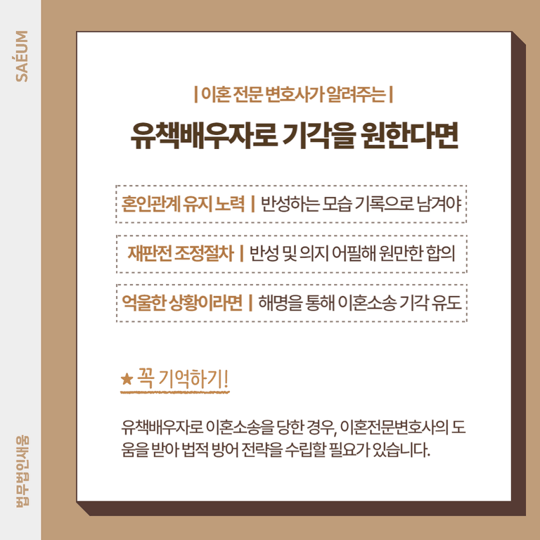 만약 억울한 누명을 썼다면, 충분한 해명을 통해 법원으로부터 이혼 소송 기각을 받을 수 있도록 조치해야 합니다. 이를 위해서는 반드시 이혼전문변호사의 도움을 받아 법적 방어 전략을 수립하는 것이 중요합니다.