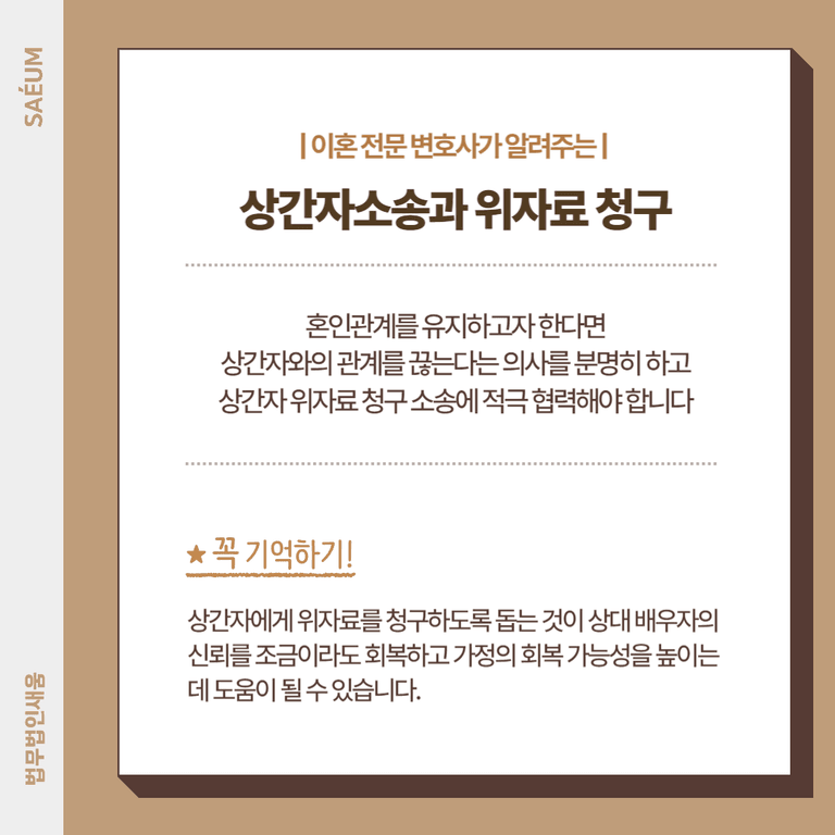만약 혼인 관계를 유지하려 한다면, 상간자와의 관계를 끊겠다는 의사를 분명히 하고, 배우자가 상간자에게 적정한 위자료를 청구할 수 있도록 협력하는 것도 방법입니다. 이렇게 함으로써 상대 배우자의 신뢰를 조금이라도 회복하고, 가정의 회복 가능성을 높일 수 있습니다.