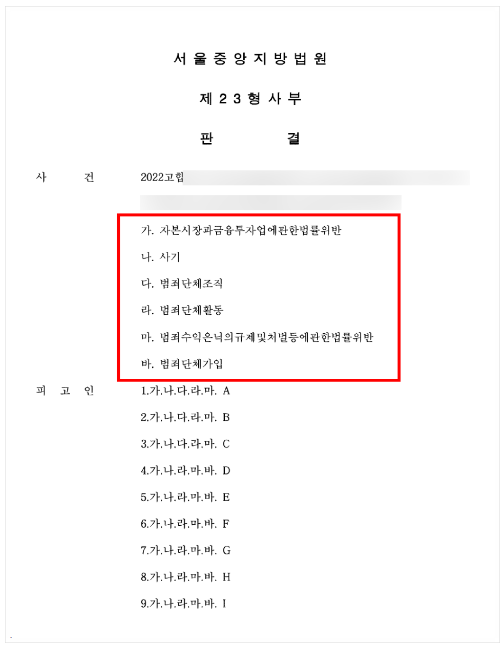 이에 피해자 다수가 고소를 하였고, 피고들은 아래와 같이 다양한 죄목으로 기소가 되었습니다. 피해자들은 페이퍼컴퍼니의 실체가 없고 허위의 정보를 제공한 피고의 행위를 객관적인 사실에 근거하여 소명하였고, 이에 피고들은 자본시장법 위반/범죄수익은닉규제및처벌등에관한법률위반/사기/범죄단체조직,가입,활동의 죄명으로 유죄판결을 선고 받았으며, 특히 총책으로 지목된 피고인은 징역 12년을 선고받게 되었습니다.