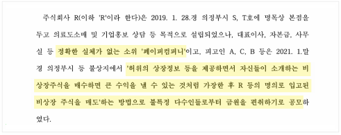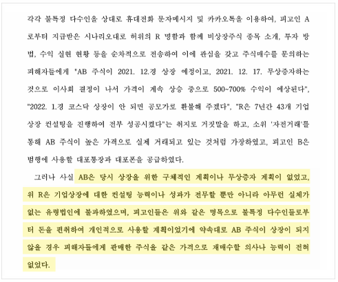 예시로 비상장주식 사기조직이 처벌받은 판결문을 소개해 드리겠습니다. 이 사건은 사기조직이 페이퍼컴퍼니를 만들어 놓은 후 자기들이 확보한 비상장주식을 다수의 피해자들에게 비싸게 판매하였습니다. 사기조직의 총책인 A는 종목을 선정하여 비상장주식을 확보하였고, 영업사원들을 교육하여 주식을 판매하게 한 후 범죄수익금을 분배하는 등의 전형적인 사기행각을 벌였습니다.