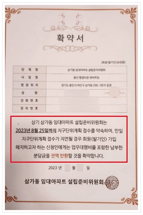 최동욱 변호사의 검토에 따르면 삼가동 임대아파트 설립준비위원회는 아래와 같이 계약자들에게 "지구단위계획 접수가 지연될 경우(발기인) 가입 해지하고자 하는 신청인에게는 업무대행비를 포함한 납부한 분담금을 전액 반환할 것을 확약합니다."라고 기재된 확약서를 교부하였습니다. 해당 확약서는 협동조합형 민간임대주택과 흡사한 사업방식을 가지고 있는 지역주택조합에서 발행하는 안심보장증서와 동일한 형태의 문서로, 이미 다수의 법원에서 법적 실효성이 없다고 판단한 문서입니다.