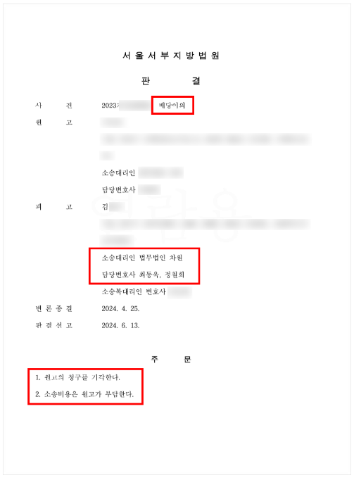 이에 대해 재판이 진행된 서울서부지방법원에서는 최종적으로 의뢰인(피고)의 손을 들어주었습니다.