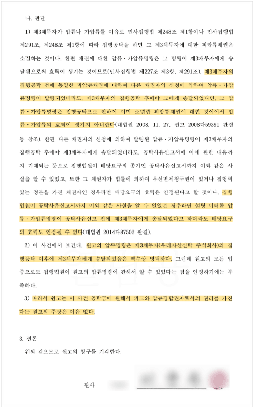 법원은 제3채무자의 집행공탁 전에 동일한 피압류채권에 대하여 다른 채권자의 신청에 의하여 압류·가압류명령이 발령되었더라도, 제3채무자의 집행공탁 후에야 그에게 송달되었다면, 그 압류·가압류명령은 집행공탁으로 인하여 이미 소멸한 피압류채권에 대한 것이어서 압류·가압류의 효력이 생기지 아니한다는 대법원 판결(대법원 2008다59391 판결)을 근거로, 원고의 압류명령이 제3채무자의 집행공탁 이후에 제3채무자에게 송달된 것이 명백하므로 원고의 주장에는 이유가 없음을 판시하였고, 이로 인해 의뢰인께서는 소송에서 성공적으로 방어하여 아래와 같이 배당금에 해당하는 납입금 전액인 약 4천만 원을 무사히 회수하시게 되었습니다.