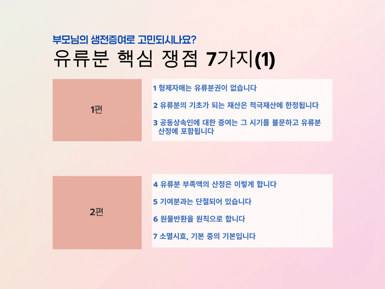 오늘은 유류분에 관한 F&Q를 엄선해서 준비했습니다. 최근 헌법재판소의 위헌결정 등이 나오면서 유류분에 관한 일반인들의 관심이 한층 높아지게 되었죠. 가족들 간의 상속 분쟁이 걱정되는 분들은 반드시 알고 계셔야 할 내용들입니다.