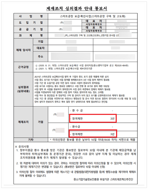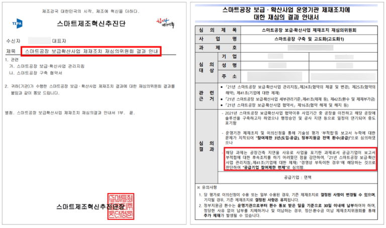 결국 스마트제조혁신추진단과 중소기업기술정보진흥원은 최근 재심의위원회를 개최하여 아래와 같이 의뢰인 회사에 대한 기존 참여제한처분을 취소하는 내용의 '공급기업 참여제한 면제처분'을 결정하여 사건이 성공적으로 종결 되었습니다.