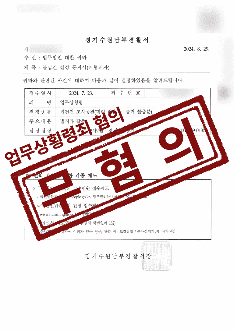 법무법인 대환 변호인단은 즉시 이 부분들을 검토하였습니다. 수사단계에서부터 조력을 하였고 경찰조사에서부터 조력한 결과 입건전에 업무상횡령죄에 대한 조사대응에 나서 경찰단계에서 무혐의로 종결지을 수 있었습니다.
