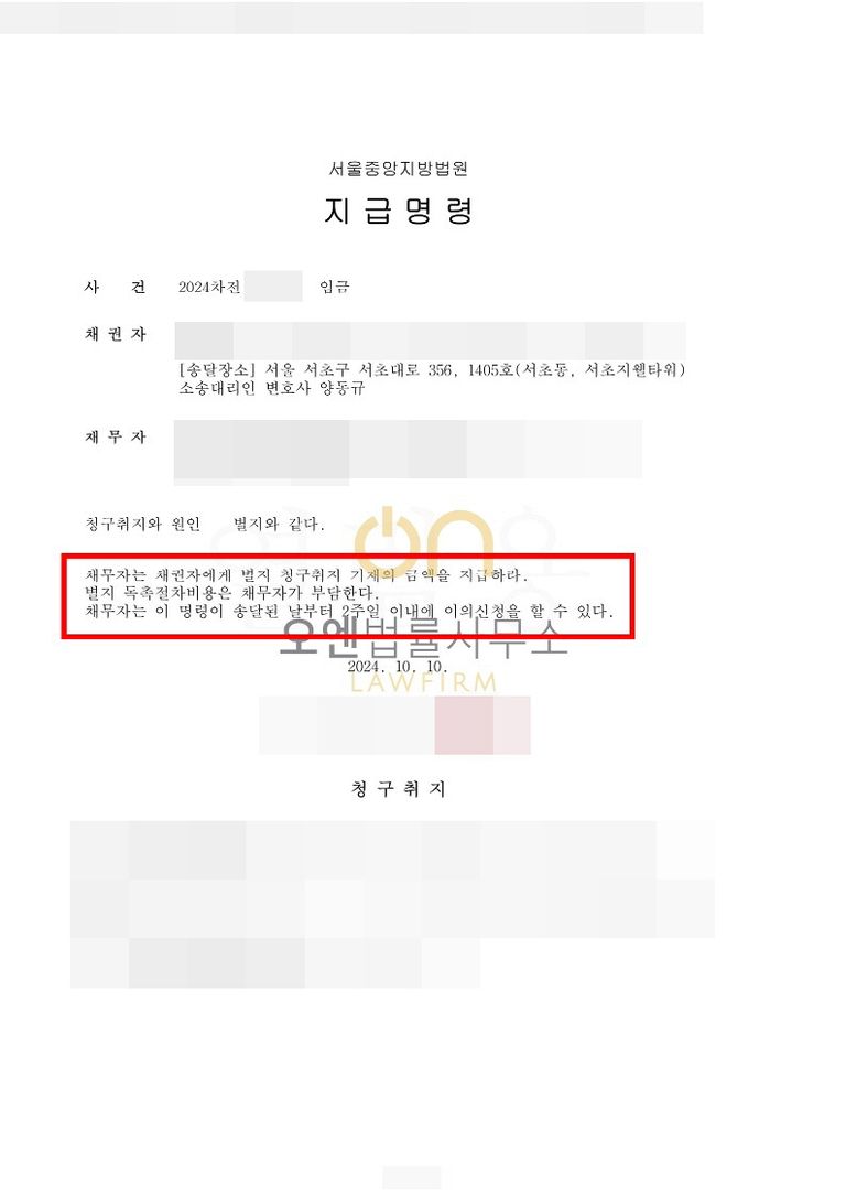 오엔법률사무소는 관련 서류를 근거로 곧바로 지급명령을 신청하였습니다.