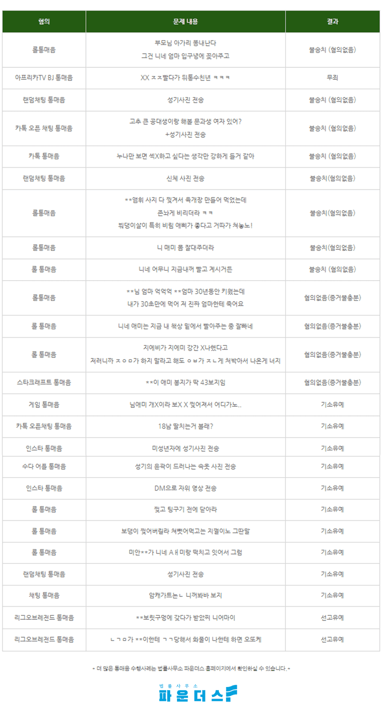 통매음 사건 중 많은 비중을 차지하고 있는 게임 통매음 사건은 상대를 향한 비난을 이어가는 과정에서 패드립 발언 및 성적 발언을 하는 것이 주된 문제가 되고 있습니다.