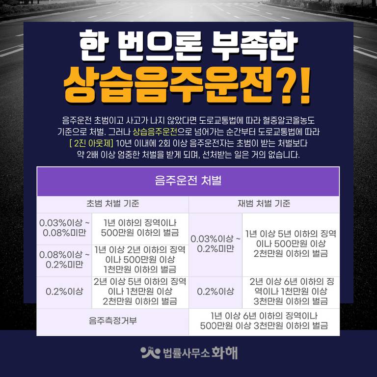 오늘은 법률사무소 화해에서 반복하고 또 반복하는 상습음주운전에 대해 알려드릴게요.