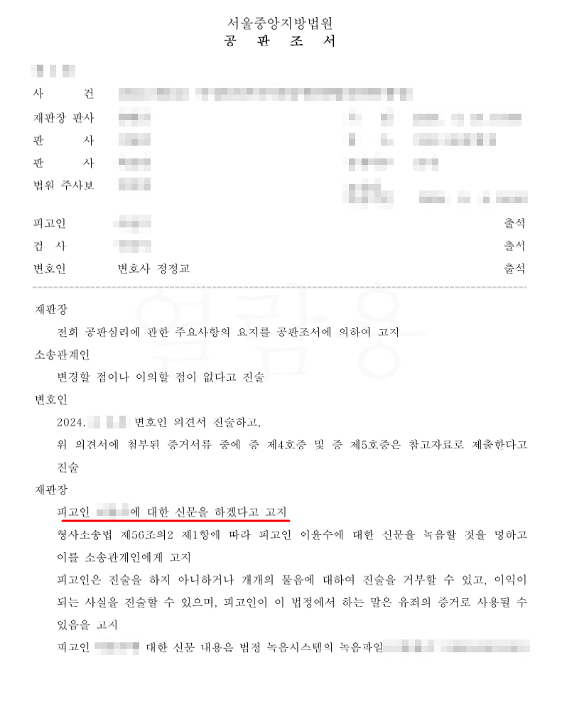 재판부 역시 정정교 변호사의 요청이 타당함을 인정하였고, ①증인신청 및 ②검찰의 녹음파일 제출을 모두 허락해주었습니다.