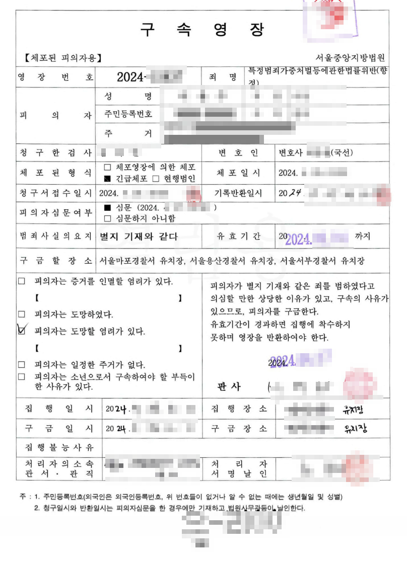 당시에는 정정교 변호사가 선임되지 않았던 상태였기 때문에 국선변호인이 피의자에 대한 영장실질심사 변호를 진행하였는데, 사안이 사안인 만큼 서울중앙지방법원은 피의자에 대하여 구속영장을 발부하였습니다.