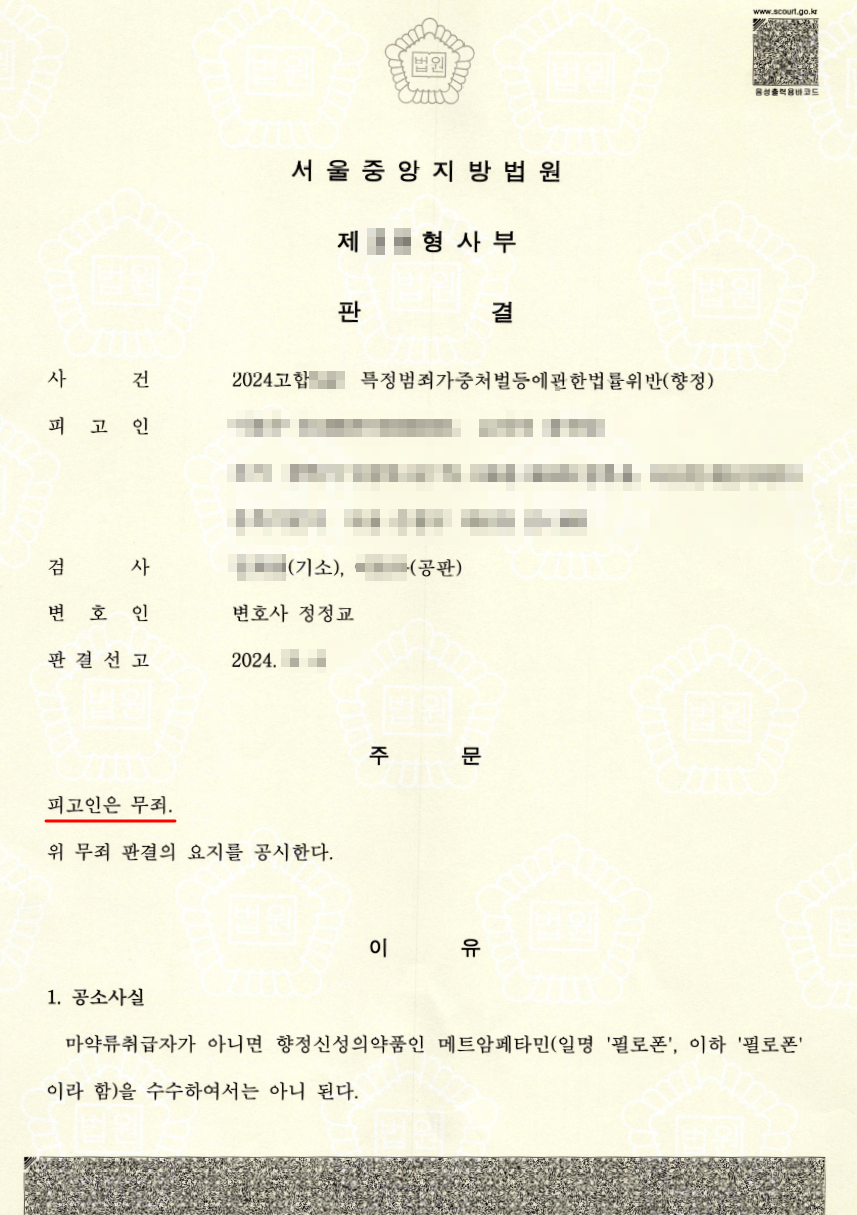 아래 사건은, 특가법위반(향정)죄로 구속기소된 피고인에 대하여 정정교 변호사가 직접 1심 변호를 진행하여 법원으로부터 전부 무죄 판결을 이끌어내 피고인을 석방시켜준 사례입니다.