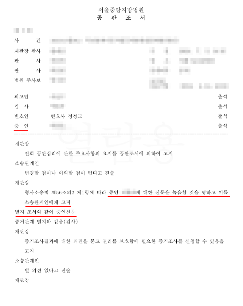 이에 따라 정정교 변호사는 중요 증인에 대하여 증인신문을 할 수 있었고 피고인에게 유리한 진술을 이끌어냈습니다.