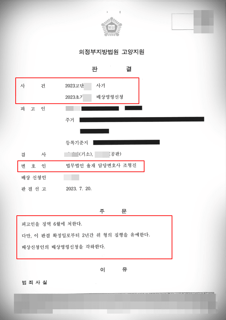 본 사건의 피고인 변호를 맡은 저희 율재로서는 의뢰인을 보호하고 재판부의 선처를 최대한 이끌어내기 위한 전략을 토대로 만족스러운 결과를 도출할 수 있었습니다.