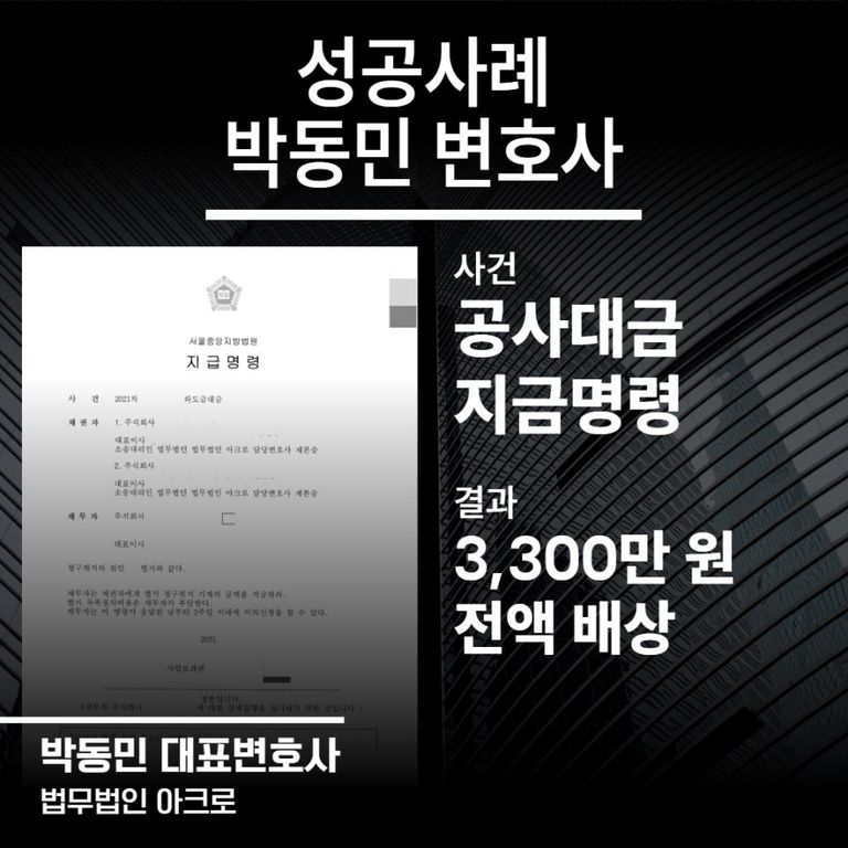 안녕하세요. 법무법인 아크로, 공사대금 전문 박동민 변호사입니다.