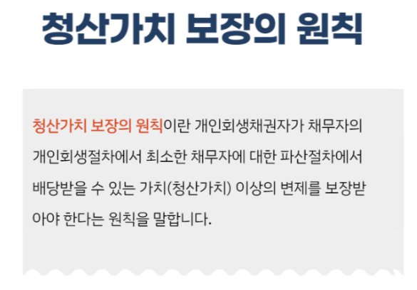 개인회생을 진행하게 될 경우, [월평균 소득 - 최저생계비 등]을 제외하여 가용소득(월변제금)을 계산하게 되는데, 이때 납부해야 하는 월 변제금 총액의 청산가치보다 많거나 같아야 합니다. 이것을 [청산가치 보장의 원칙]이라고 합니다.