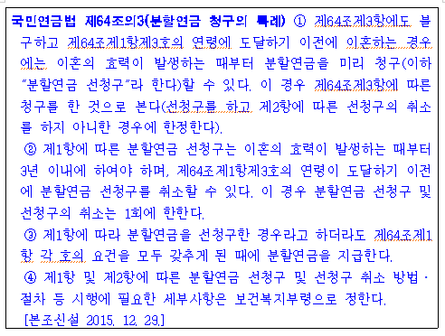 60세 이전에 이혼을 할 경우 노령연금의 지급시기가 너무 많이 남아있을 수 있으니 까먹지 않게 미리 청구할 수 있게 해주는 것입니다.