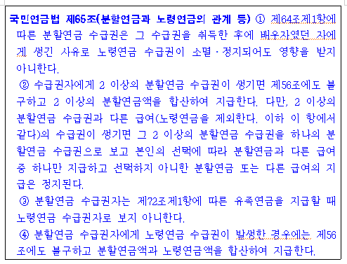 또한, 분할연금수급권자에게 노령연금 수급권이 발생할 수 있을텐데 그 경우에는 두 연금을 합산해 지급합니다.