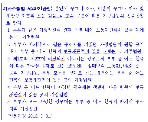 이 때 상대방 주소지 관할 가정법원이나 부부가 마지막으로 같은 주소를 가졌던 가정법원에 이혼 소송을 청구하면 됩니다.