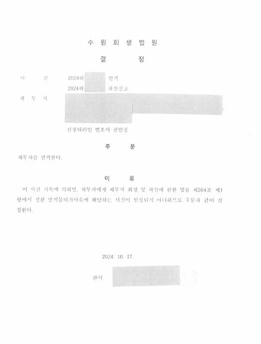 그 결과 법원은 해당 신청인에게 면책결정이라는 최종 결정을 내렸습니다.
