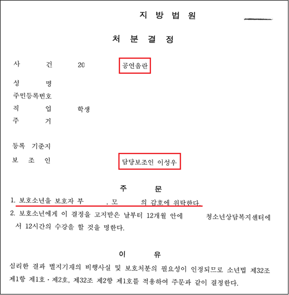 법원은 변호인(보조인)의 적극 주장한 사정을 참작하여, 보호소년이 보호처분으로 인해 시간을 뺏기는 일이 없도록 최대한 선처하였고, 사회봉사명령(3호 처분)은 배제하고 적은 시간의 수강명령만 이행할 수 있도록 하여 1호 및 2호의 가벼운 처분 결정을 하였습니다.