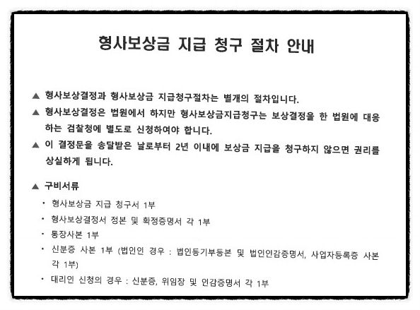 보상결정을 한 법원에 대응하는 검찰청에 별도로 ‘형사보상금 지급청구’를 해야 합니다.