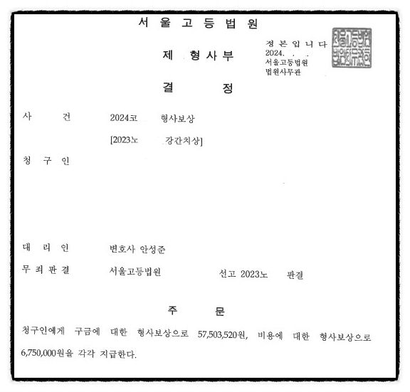 최근 진행한 사건 중 강간치상 혐의로 1심에서 죄인의 누명을 쓰고 법정구속 되었다가, 다행히 항소심에서 무죄판결을 받고, 검사의 상고에 대하여 대법원이 상고기각을 함으로써 최종적으로 무죄판결이 확정된 사건이 있었습니다. 의뢰인께서 억울한 누명을 쓰고 구속까지 되는 등 재판을 받는 동안 감당해야 했던 정신적 고통은 이루 말할 수 없었을 텐데요, 이에 저희 사무실에서는 의뢰인을 위해 구속에 대한 형사보상과 비용에 대한 형사보상을 법정 최고 한도로 청구해 드렸고, 그 결과 상당금액을 형사보상으로 인정받게 되었습니다.