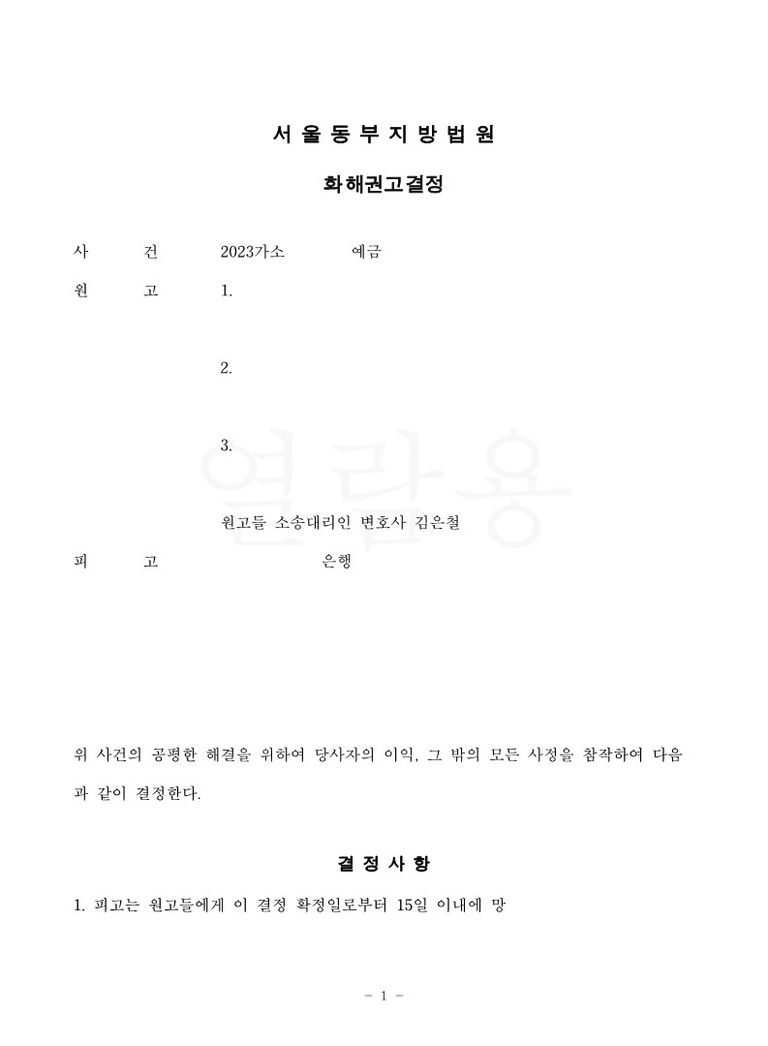 법원은 원고들 소송대리인의 주장을 인정하여 피고의 원고들에 대하여 법정상속분에 따른 예금채권의 지급의무를 인정하면서 피고가 원고들에게 일정금액을 지급하는 것으로 화해권고결정을 하였고, 원고들과 피고는 이에 이의를 하지 아니하였습니다.