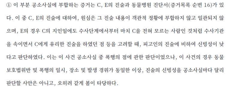 - C씨와 또 다른 목격자 E씨의 진술이 객관적 정황과 부합하지 않고 일관성이 떨어짐