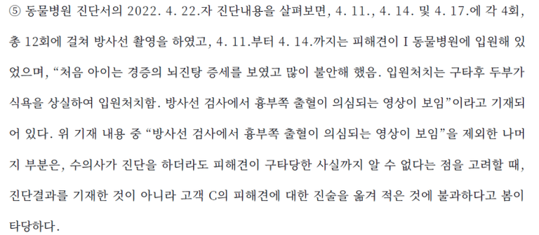 - 해당 반려견에게 치료일수 미상의 뇌진탕 및 흉부 쪽 출혈의 상해를 입힘