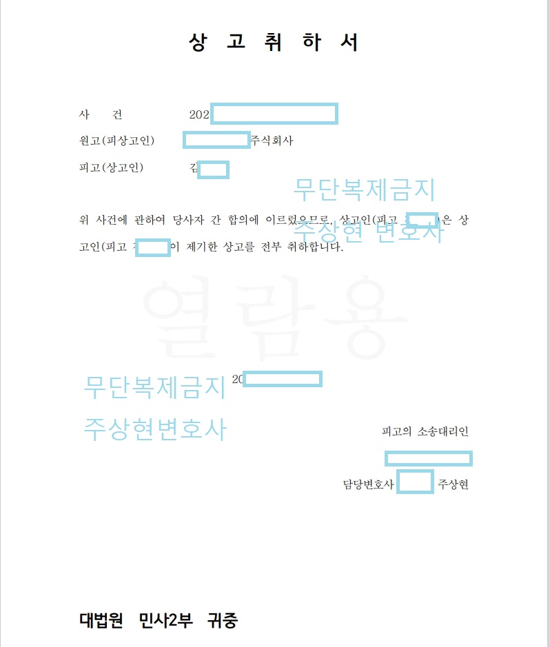 상대방은 저희가 작성한 상고이유서를 송달 받아 보더니 의뢰인에게 먼저 연락하여 합의를 제안하였습니다. 아마도 패소 가능성이 높다고 판단하여 합의를 제안했던 것으로 보입니다.