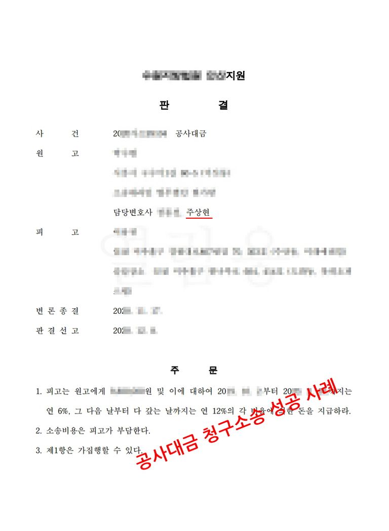 공사대금 청구사건에서 전부 승소한 사례입니다.