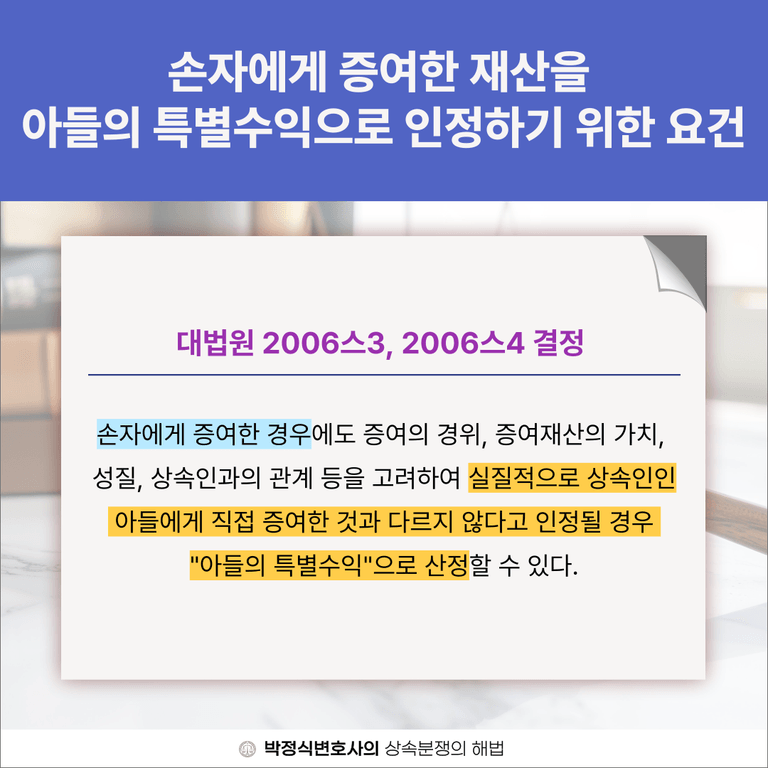 위와 같이 제3자(손자나 며느리, 사위 등)에게 증여한 경우에도 예외적으로 “증여 또는 유증의 경위, 증여나 유증된 물건의 가치, 성질, 수증자와 관계된 상속인이 실제 받은 이익 등을 고려하여 실질적으로 피상속인으로부터 상속인에게 직접 증여된 것과 다르지 않다고 인정되는 경우에는 상속인의 직계비속, 배우자, 직계존속 등에게 이루어진 증여나 유증도 특별수익으로서 이를 고려할 수 있다고 함이 상당하다.”고 결정한 바 있습니다(대법원 2007. 8. 28.자 2006스3, 2006스4 결정).