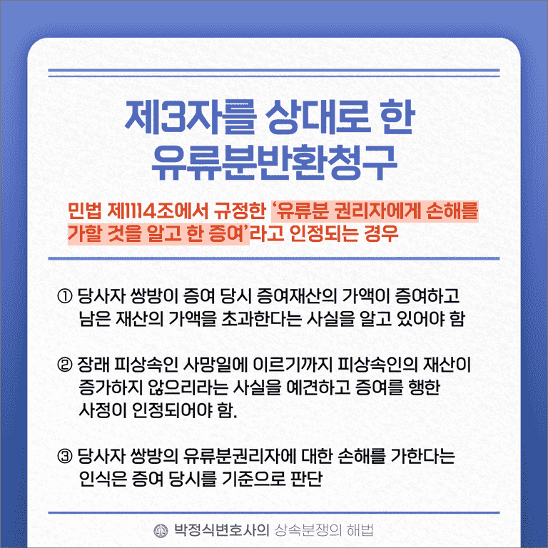 특히 위 3가지의 요건을 충족하는 증여라는 점에 대해서는 유류분반환청구권자가 이를 구체적으로 "입증"하여야 하는 것입니다.