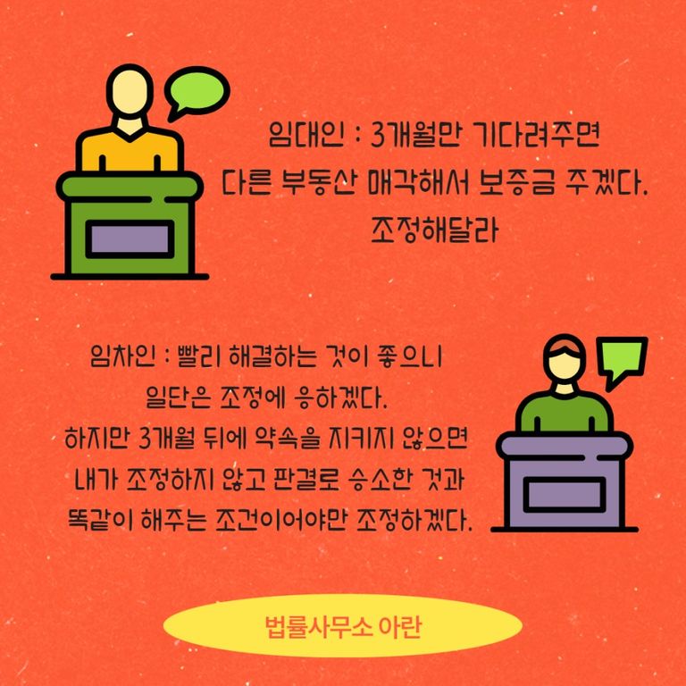 조정 당일, 집주인은 '3개월만 시간을 주면 보증금을 전액 반환하겠다. 하지만 지연손해금과 변호사비용까지는 무리다. 그러니 3개월 뒤에 원금을 지급하는 것으로 조정을 해달라'라는 입장을 보였습니다.