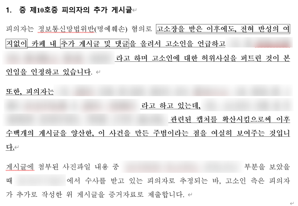 앞서 말씀드린 대로, '특정성' 요건이 가장 관건이었는데 의뢰인분의 신상정보는 블로그에 나와있어서 이 부분은 문제가 없었지만 익명의 악플러들이 별칭을 만들어서 의뢰인분을 지칭하고 있어 문제가 되었습니다.