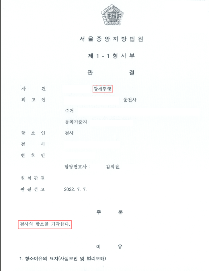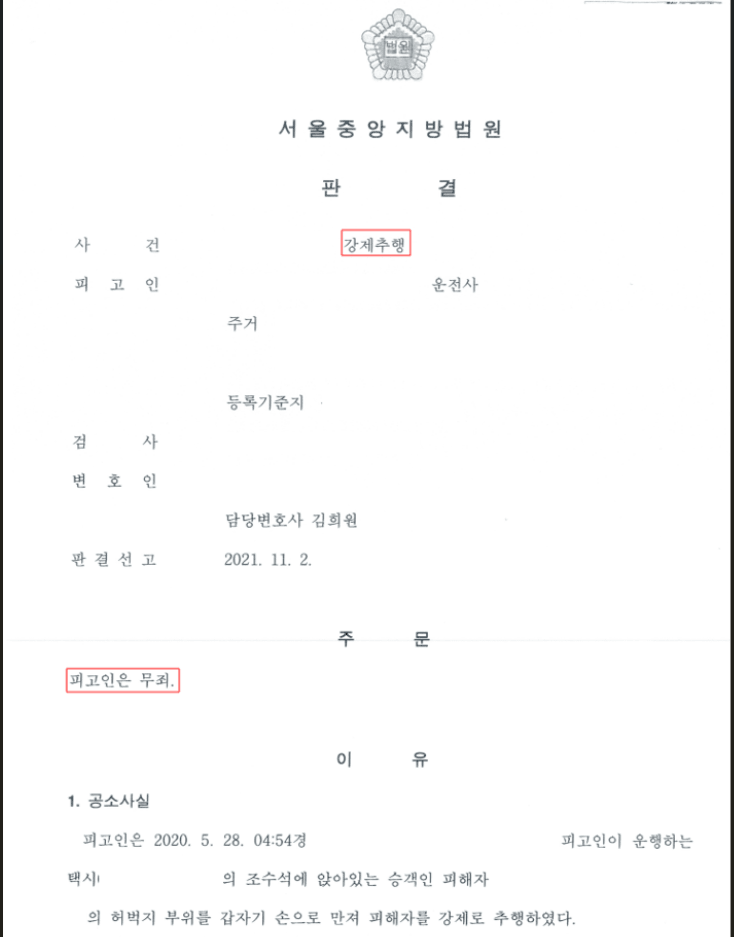 제가 담당하여 수행하였던 택시기사가 여성 손님을 상대로 추행을 저질렀다는 이유로 강제추행으로 기소되었다가 1심에서 무죄 선고받고, 이에 검사가 불복하여 항소하자 2심에서도 무죄 취지로 검사 항소가 기각된 성범죄 성공사례를 소개하여 드리겠습니다.