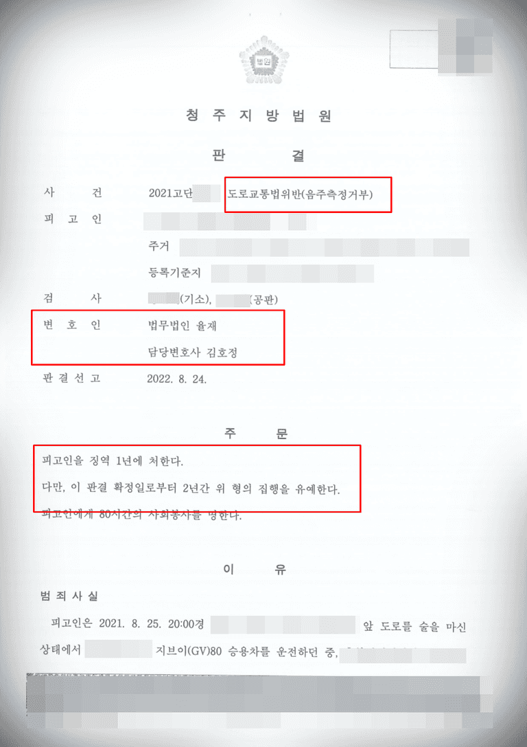 최근 음주 측정 거부 혐의도 무겁게 처벌하는 수사기관과 사법부의 분위기로 인해 의뢰인께선 저희 율재를 찾아주시어 사건을 신속하게 의뢰하였습니다.