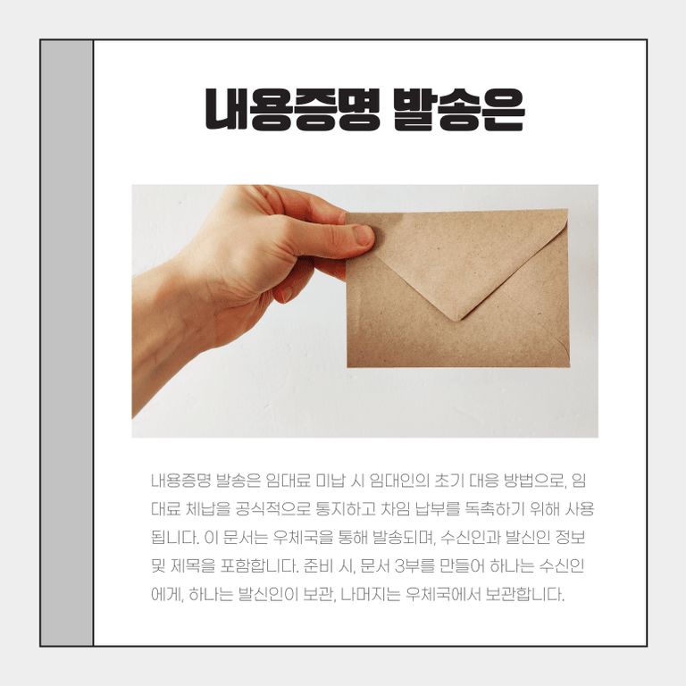 월세미납내용증명을 발송하는 것은 초기 대응 방법 중 하나입니다. 내용증명 발송은 임차인에게 법적 조치를 취하기 전에 월세미납 사실을 공식적으로 통지하고, 임대차 계약의 내용을 상기시키며, 월세 납부를 독촉하는 용도로 활용됩니다. 내용증명은 우체국을 통해 발송되며, 수신인과 발신인의 정보, 제목 등을 포함한 문서로 구성됩니다. 월세미납내용증명을 준비할 때는 동일 문서 3부를 준비하여 하나는 수신인에게 등기우편으로, 하나는 발신인이 보관하고, 나머지 하나는 우체국에서 보관하는 방식으로 진행합니다.