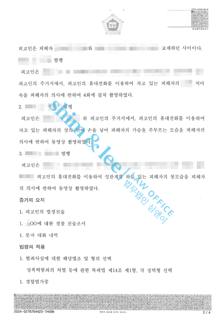 4. 또한 재판부에 피해자 변호사 의견서를 제출하여 연인관계였던 신뢰관계를 악용하여 불법촬영을 저지르고, 피해자가 이를 인지하지 못하였다는 것을 기회로 몇 차례 계속하여 범행을 저지른 가해자의 죄질을 지적하고, 이로 인해 의뢰인이 극심한 정신적 피해를 호소하고 있음을 어필하였습니다.