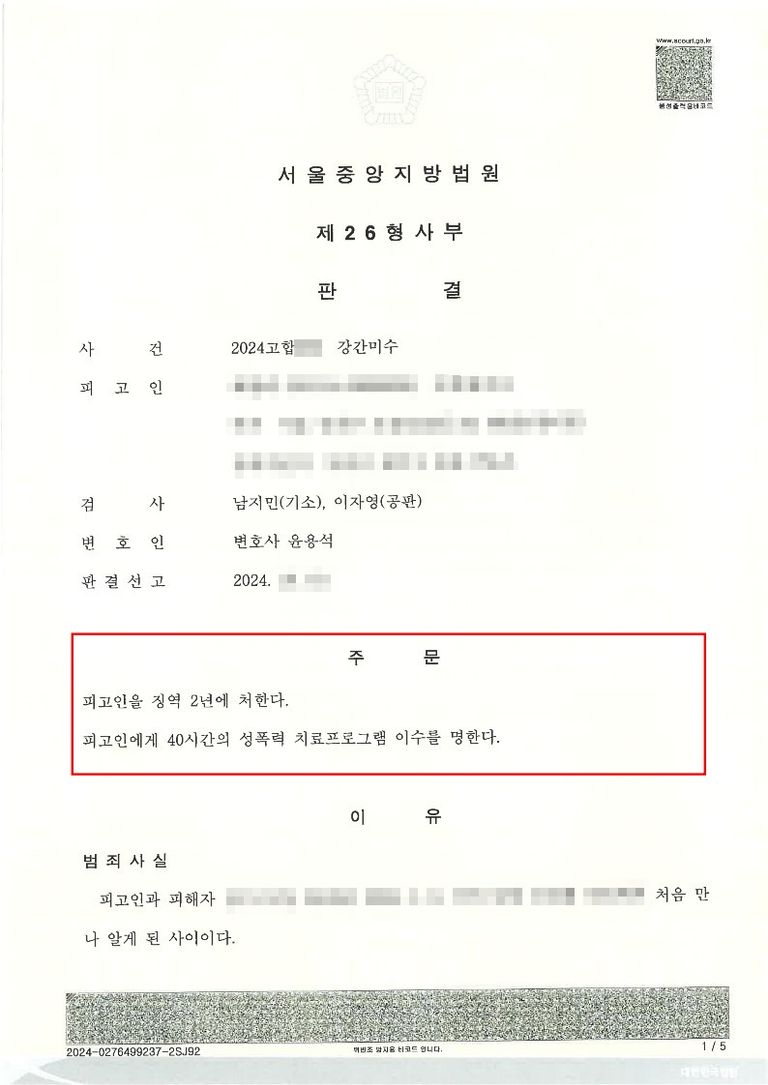 - 재판부에서는 피해자 사건 이후 상당한 성적 수치심과 정신적 충격을 받았을 것이라는 점을 인정하여 피해자의 손을 들어주었고, 가해자에게는 강간미수 죄가 인정되어 징역2년, 성폭력 치료강의 40시간 수강명령의 실형이 선고 되었습니다.
