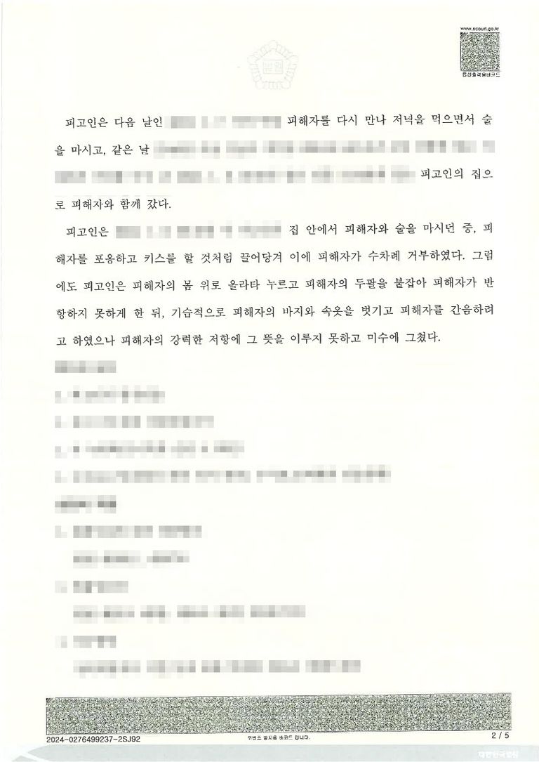 - 이후 가해자는 의뢰인의 몸 위에 올라타 움직이기 못하게 하며 성관계를 시도했습니다. 의뢰인은 단호하게 ”비켜라, 너랑 안 잘 거다, 집에 갈 거다”라고 소리쳤지만, 가해자는 의뢰인을 때리려 하는 등 공포감을 조성하며 바지와 속옷을 벗기기에 이르렀습니다.