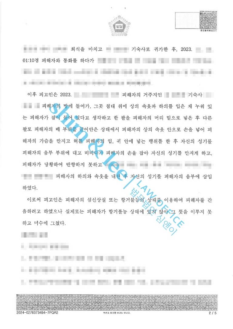 - 의뢰인은 인기척에 잠에서 깬 상태였지만, 술기운과 두려움에 온몸에 힘이 들어가지 않고, 자신이 깨어난 것을 알면 가해자가 어떠한 행동을 할지 몰라 겁에 질린 상태로 대응을 할 수 없는 상황이었습니다. 몸을 뒤척이며 최대한 피하려고 했으나 결국 강간까지 이루어지고 말았습니다.
