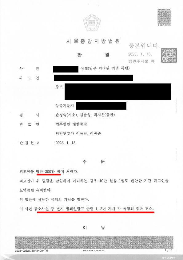 재판부도 이동규 변호사의 주장을 모두 받아들여 상해진단서의 증명력을 부정하여 상해에 관한 부분 모두 인정하지 않았으며, 단순 폭행으로만 인정하였습니다.