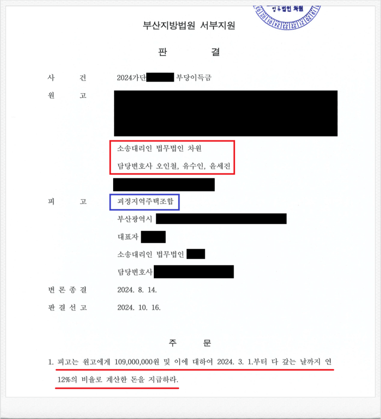 결국, 재판부는 이러한 저의 주장을 받아들였고, 피고는 의뢰인에게 109,000,000원 및 이에 대한 지연손해금을 지급하라는 내용의 판결을 이끌어 내었습니다.