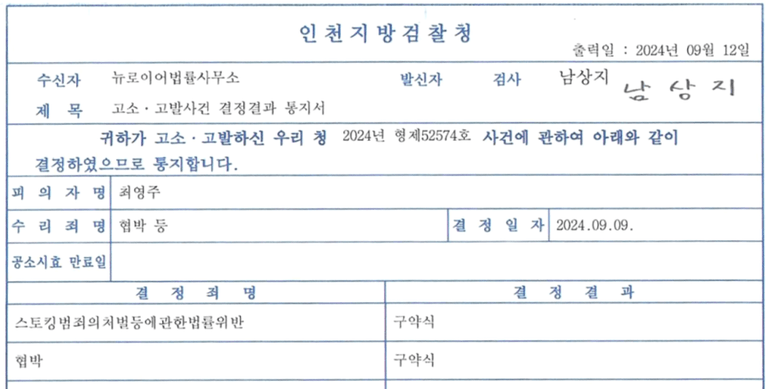 저희가 고소장에서 사실관계와 법리적 주장을 치밀하게 개진하였고, 고소인 조사 역시 철저하게 준비하여 도와드린 결과, 상대방은 경찰에서 송치가 되었으며 최종적으로 검찰에서 벌금형의 구약식 처분을 받게 되었습니다.법적인 사건은 법리적 검토를 바탕으로 정치하게 주장하여 해결해야 하는 것이 가장 바람직합니다. 이번 사건은 저희 뉴로이어 법률사무소의 스토킹, 협박에 대한 법적 전문성을 잘 보여주었습니다.